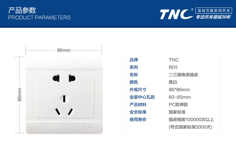 • 产品型号: tnc开关插座 五孔插座二三插座 86型开关插座面板墙壁5孔插座 J