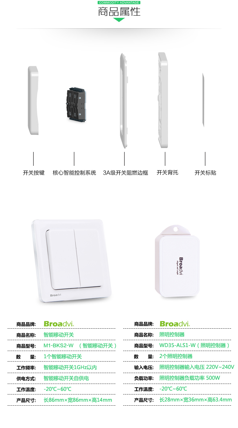 • 产品型号: Broadvi博悦免布线不用电86型二代移动开关 220V双开双控开关