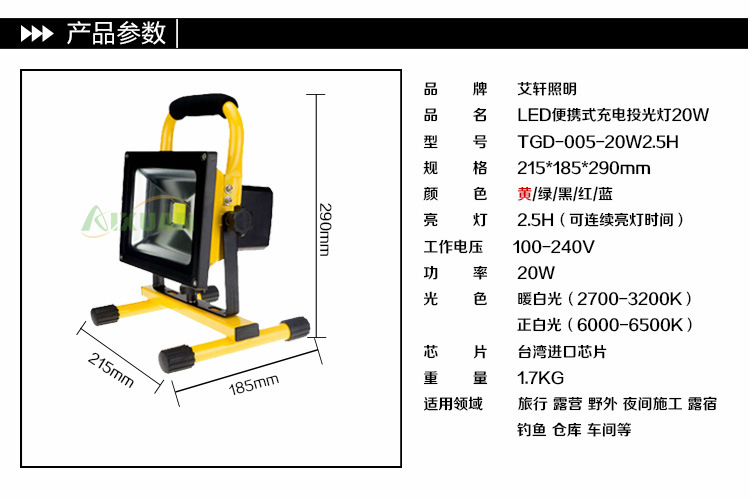 • 产品型号: 20w 充电投光灯 银钻三安LED便携投光灯 艾轩应急投光灯厂家批发