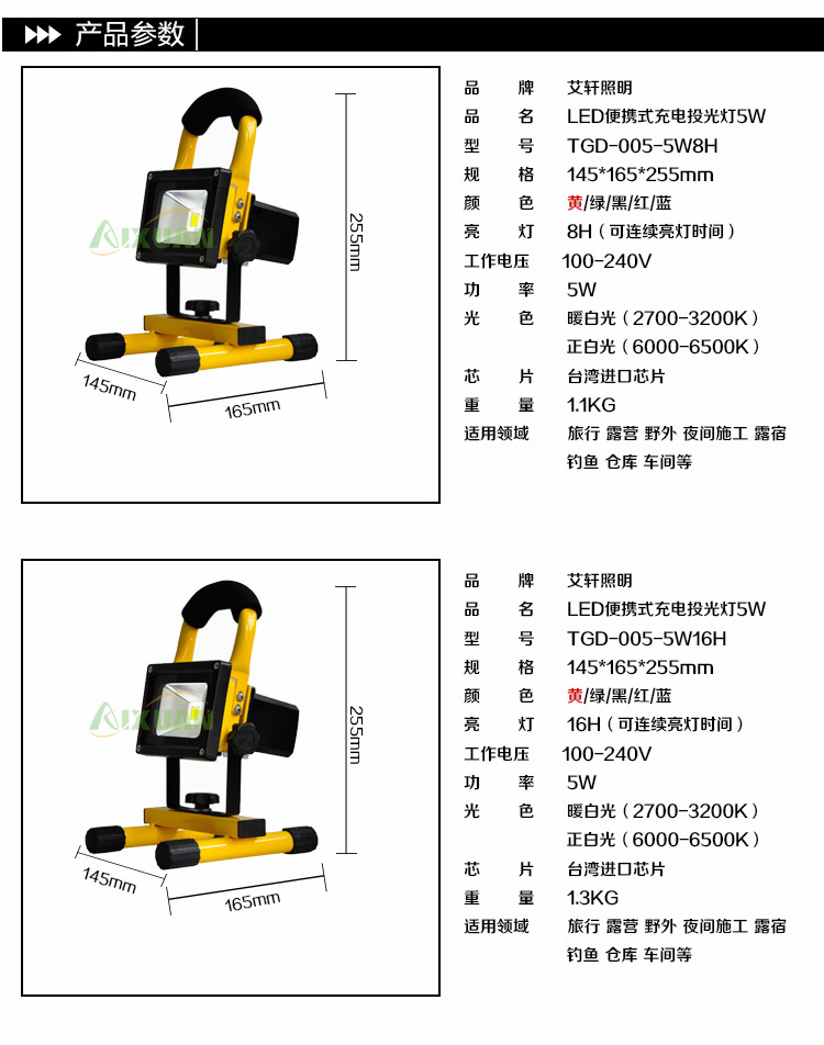 • 产品型号: 充电应急灯5W/8H 便携式5W/8H 户外led充电灯 新款LED充电投光灯