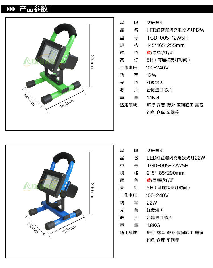 • 产品型号: 12W22W 红蓝煤闪应急指示灯 充电投光灯 led工作灯 充电灯 应急灯