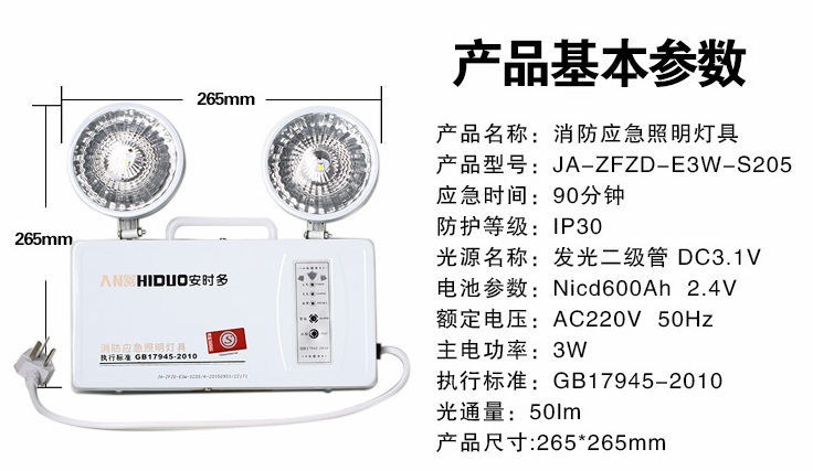 展品名称:新国标led充电式双头过道灯疏散应急照明指示灯展品品牌:安时多 展品型号:JA-ZFZD-E3W-S205