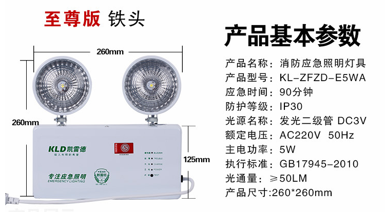 展品名称:新国标led双铁头充电安全出口应急照明消防照明灯展品品牌:凯雷德展品型号:KL-ZFZD-E5WA