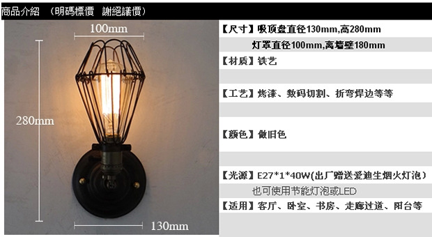 展品名称:复古工业风阳台壁灯走廊怀旧个性铁艺装饰灯具展品品牌:艾达展品型号:RYD029-X2展品颜色:古铜色主材质:铁光源类型: 白炽灯 节能灯 LED工艺: 喷漆磨砂光源个数: 1个照射面积: 5㎡-10㎡功率: 31W-40W电压: 111V~240V
