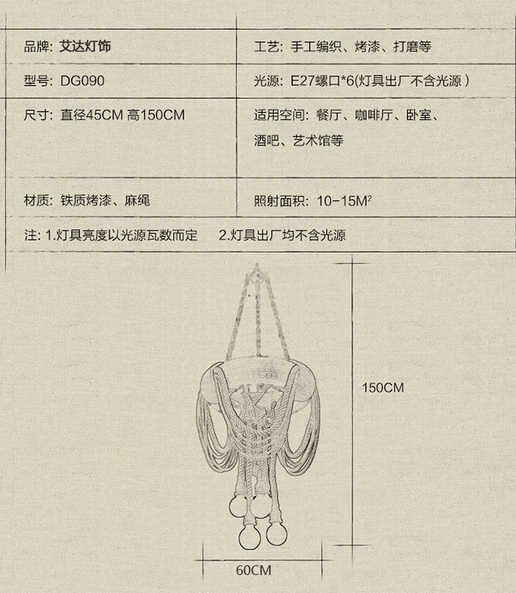 展品名称:个性彩色轮胎麻绳吊灯餐厅装饰灯具展品品牌:艾达展品型号:RYD009-D2吊灯类型: 麻绳吊灯灯具型状: 鱼线型吊灯灯头个数: 6个主材质: 铁照射面积: 10㎡-15㎡颜色分类: 蓝色、红色、黄色、黑色、绿色灯身主材质: 铁工艺: 喷漆磨砂功率: 31W-40W电压: 111V~240V