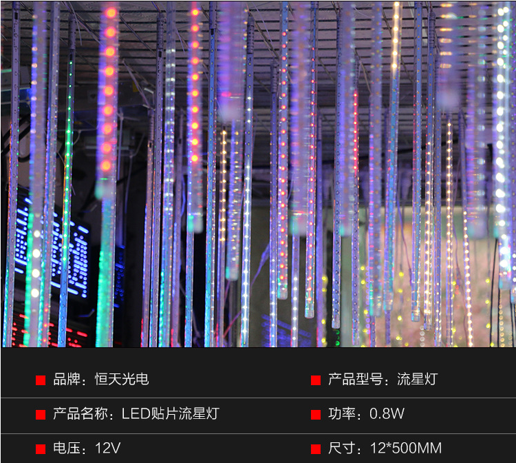 展品名称:LED双面贴片流星灯80公分LED流星管展品品牌:恒天光电展品型号:HT-LX-510尺寸:12*800mm(mm)输入电压:12(V)尺寸:12*800mm(mm)功率:0.8(W)
