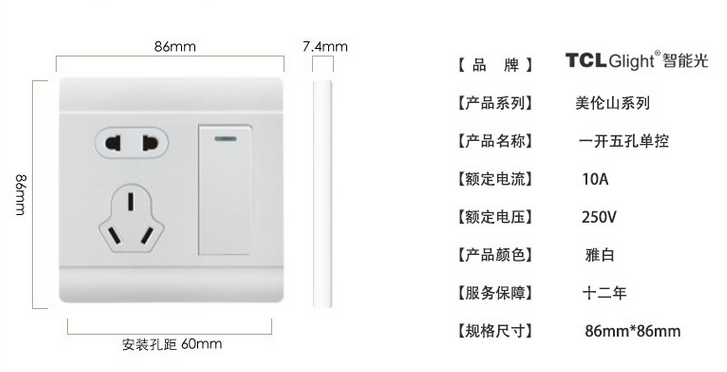 展品名称:86型雅白墙壁一位单控开关带五孔一开五孔面板插座开关展品品牌:TCL glight智能光展品型号:MLS-011颜色:雅白规格尺寸:86型 额定电压:250(V)额定电流:10(A) 启动方式:跷板开关 面板材质:PC电寿命:10(万次)