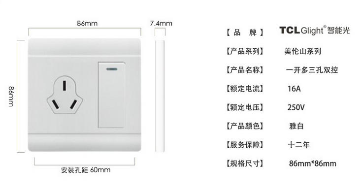 展品名称:86型雅白墙壁一开双控开关带三孔16A空调插座带开关展品品牌:TCL glight智能光展品型号:MLS-009颜色:雅白规格尺寸:86型 额定电压:250(V)额定电流:10(A) 启动方式:跷板开关 面板材质:PC电寿命:10(万次)