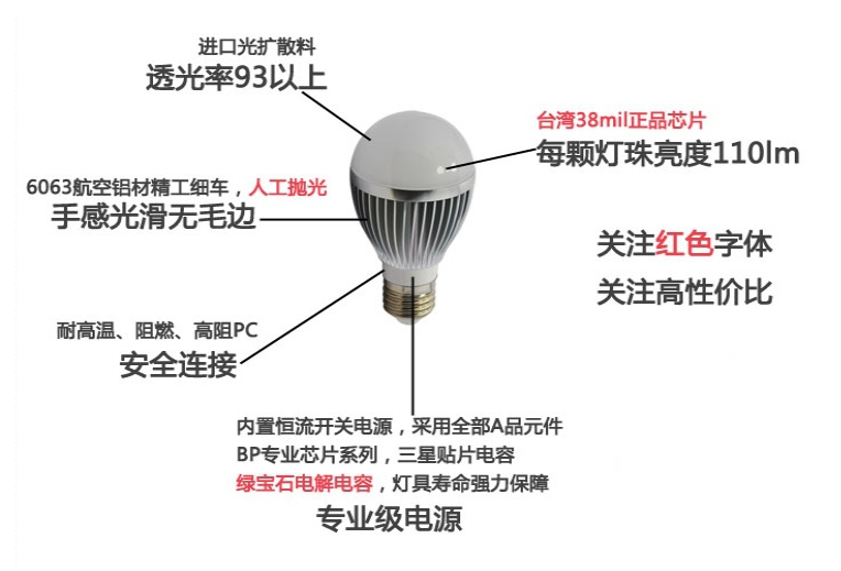展品名称:LED节能E27灯泡大功率家居用品球泡灯展品品牌:佰源凯展品型号:bykq输入电压:220(V) LED灯珠颗数:60(颗)光通量:120(lm) 显色指数:70 重量:0.1(g)灯头规格:E27 功率:3,5,7,9,12 色温:6500