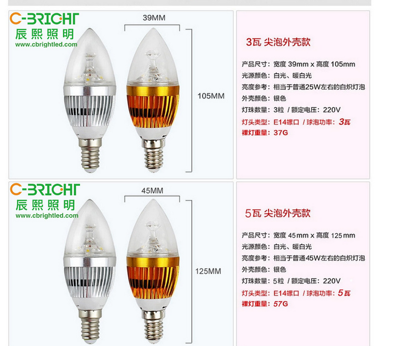 展品名称:铝合金拉尾尖泡大功率3W5WLED灯泡展品品牌:辰熙展品型号:CB-LZD02输入电压:220(V) LED芯片品牌:Epistar/晶元光电 LED灯珠型号:1W光通量:300-500(lm) 显色指数:75 功率因数:95 灯体材质:铝合金