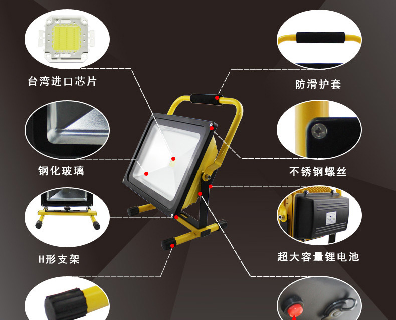 展品名称:LED工程抢修手提野露营户外移动工车载应急充电投光灯展品品牌:DONTA展品型号:充电投光灯-50W输入电压:220(V)光通量:3500(LM) 工作频率:50-60(Hz) 外壳材质:铝 平均照度:30