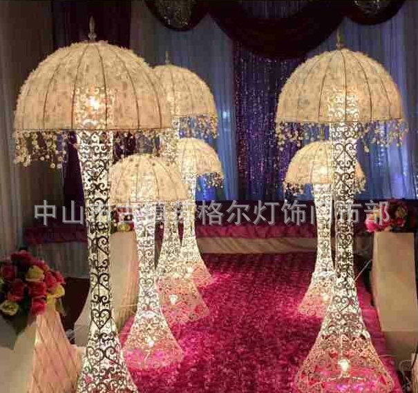 展品名称:水母路酒店高档水母路引婚庆道具展品品牌:苏格尔展品型号:雾化器香槟塔材质:铁艺+蕾丝布尺寸:大号 1.5米;中号1.38米;小号0.97米;三色彩灯串,LED灯泡颜色;烤漆白色