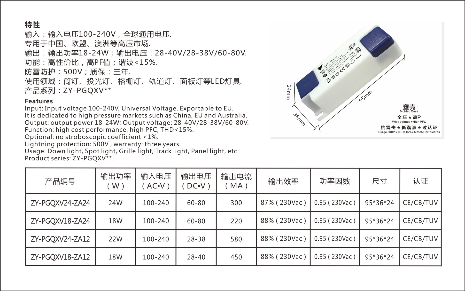 展品名称:正远电源 面板灯筒灯过TUV CE CB SAA 18-24W 全压 过认证 高P LED电源展品品牌:正远科技展品型号:ZY-PGQXV24