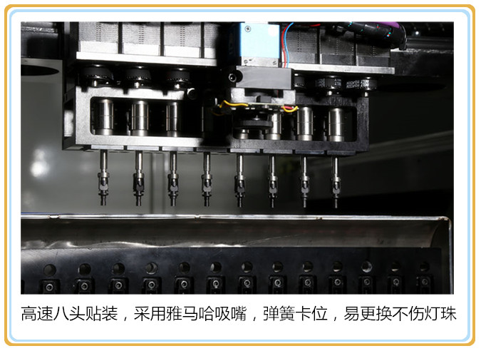 ★机器适用范围广: 可选配是否带视觉矫正相机,每个吸嘴都是独立转角,外加八个元件识别相机,除了可贴装传统的LED长灯条外,球泡灯、筒灯、射灯、吸顶灯、护栏管、LED驱动电源、铜线灯串等等均可随意贴装,端子、大功率反流明及科锐灯珠等贴装精度均能保证。