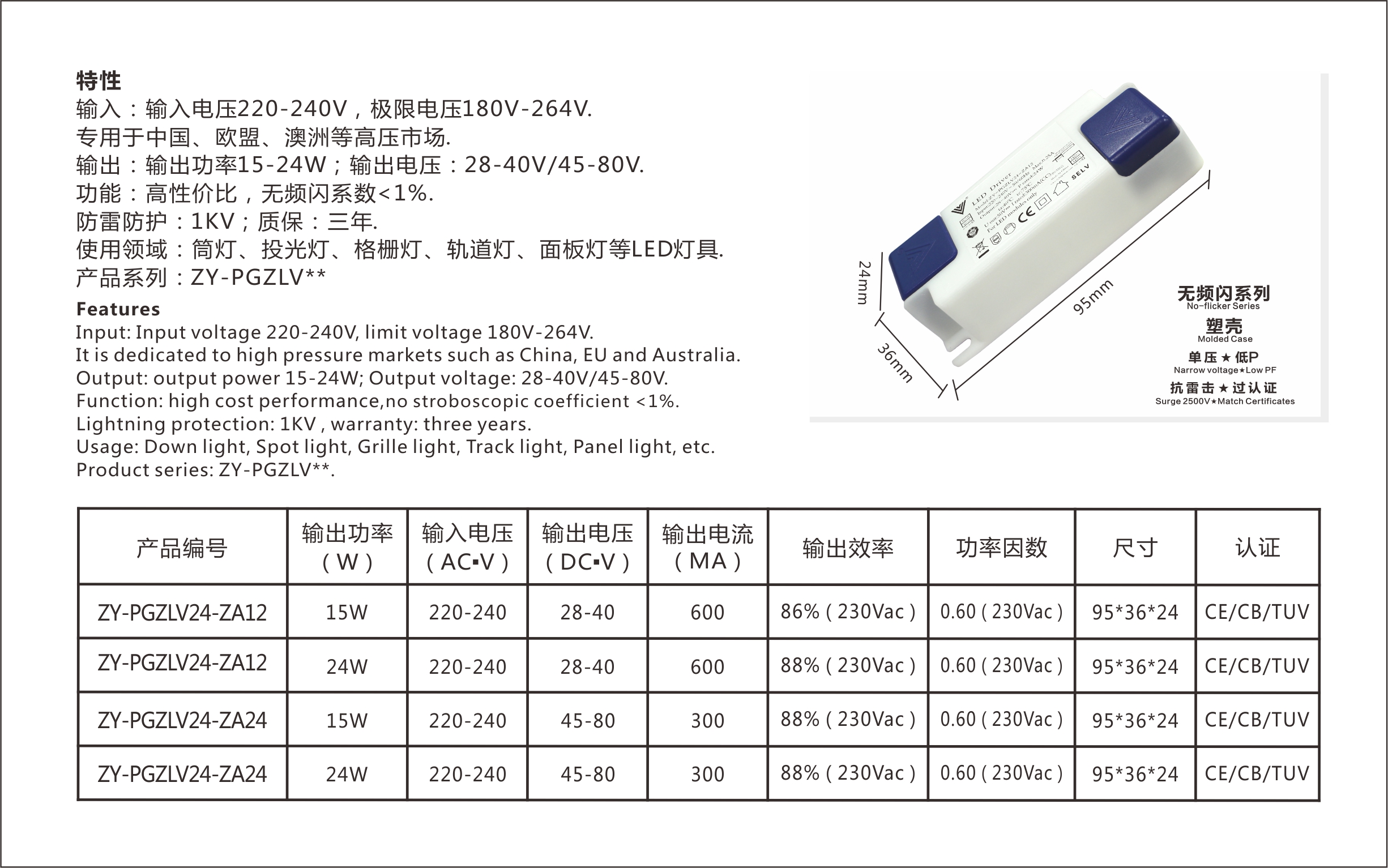 展品名称:面板灯筒灯过TUV CE CB SAA 15-24W 无频闪 过认证 低P LED电源展品品牌:正远科技展品型号:ZY-PGZLV24