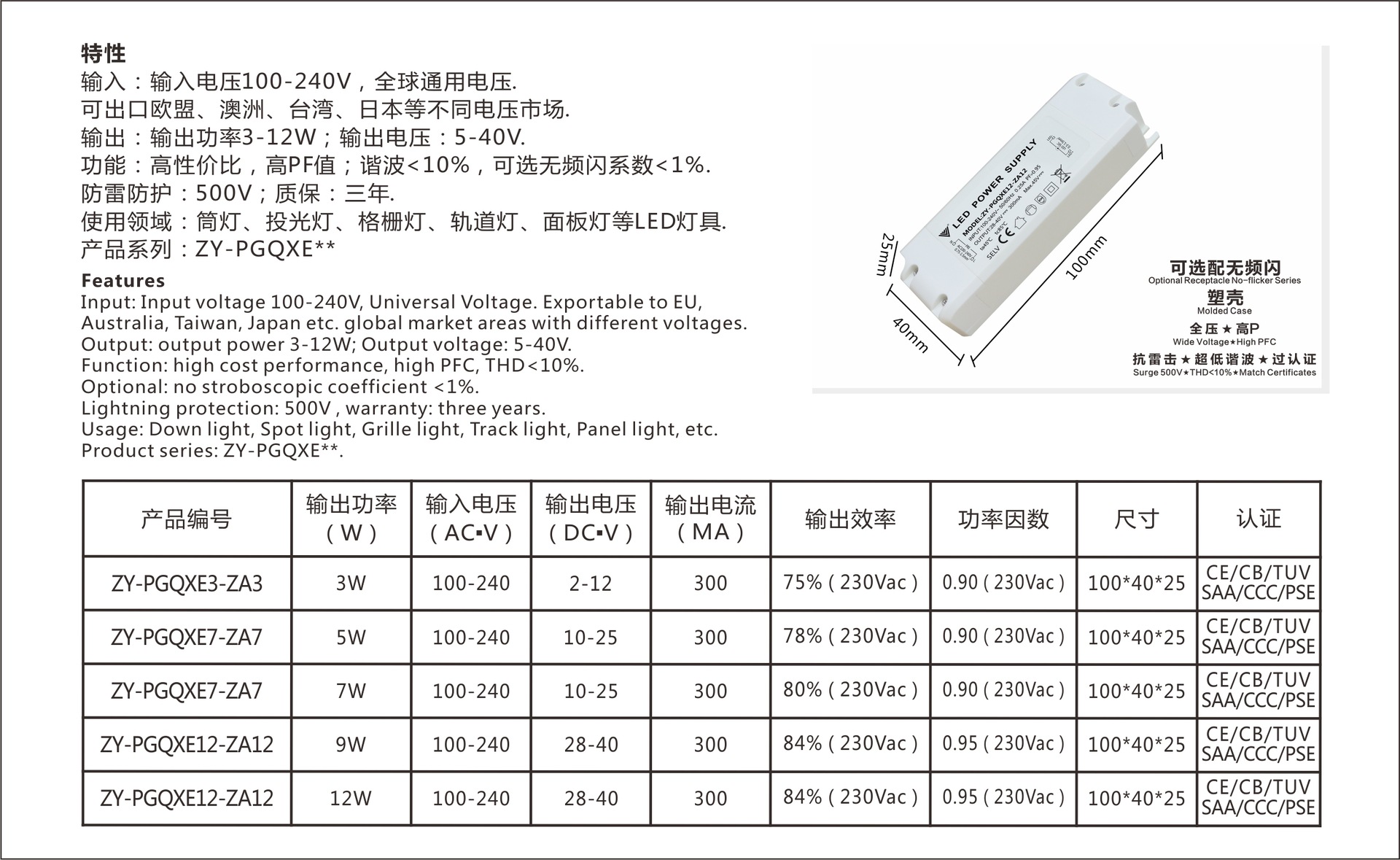 展品名称:正远电源 面板灯筒灯过TUV CE CB SAA 3-12W 全压 高P LED电源展品品牌:正远科技展品型号:ZY-PGQXE12