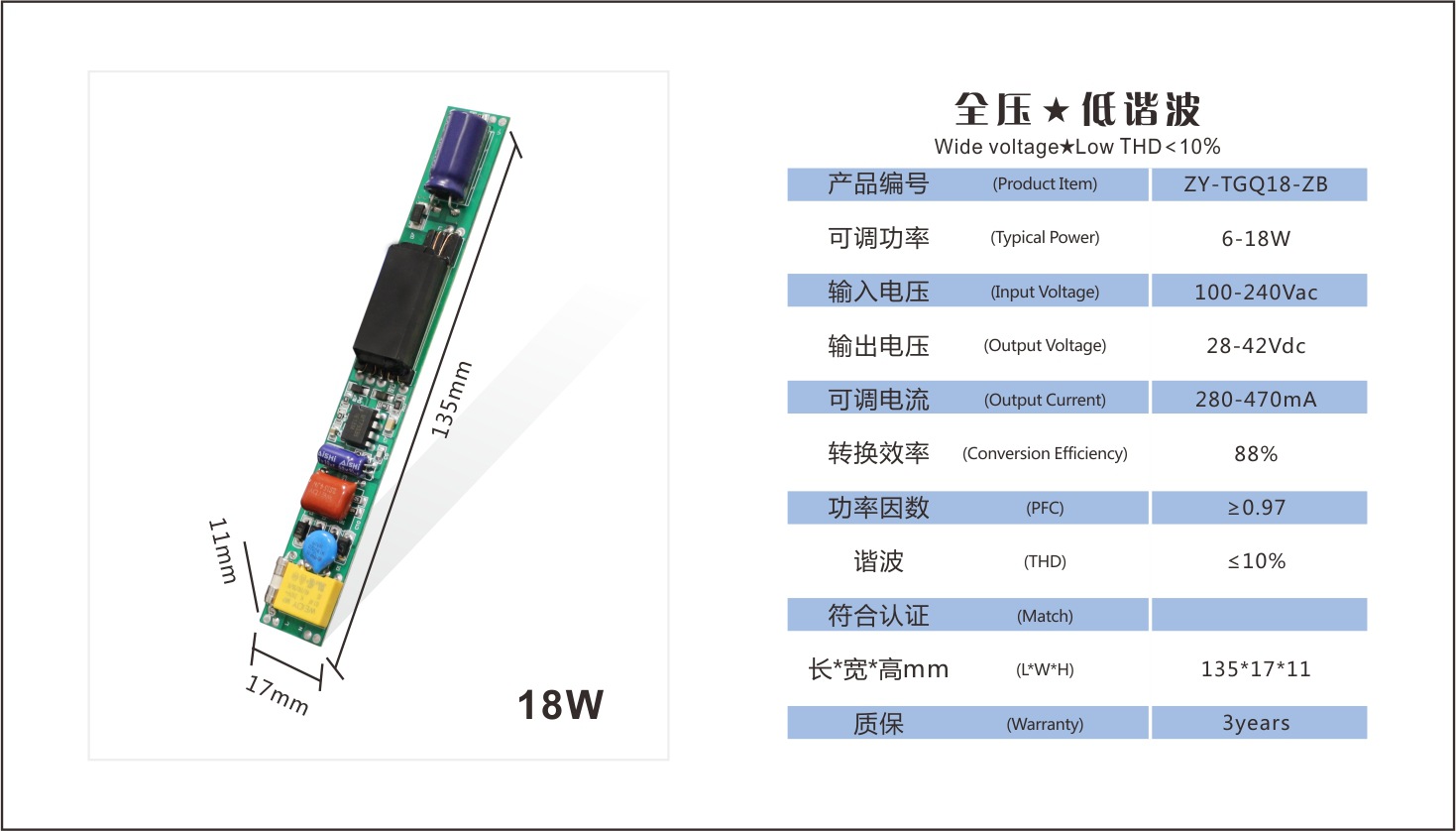 展品名称:正远电源 6-18W T8/T5 全压 高P 超低谐波 LED日光灯电源展品品牌:正远科技展品型号: ZY-TGQ18
