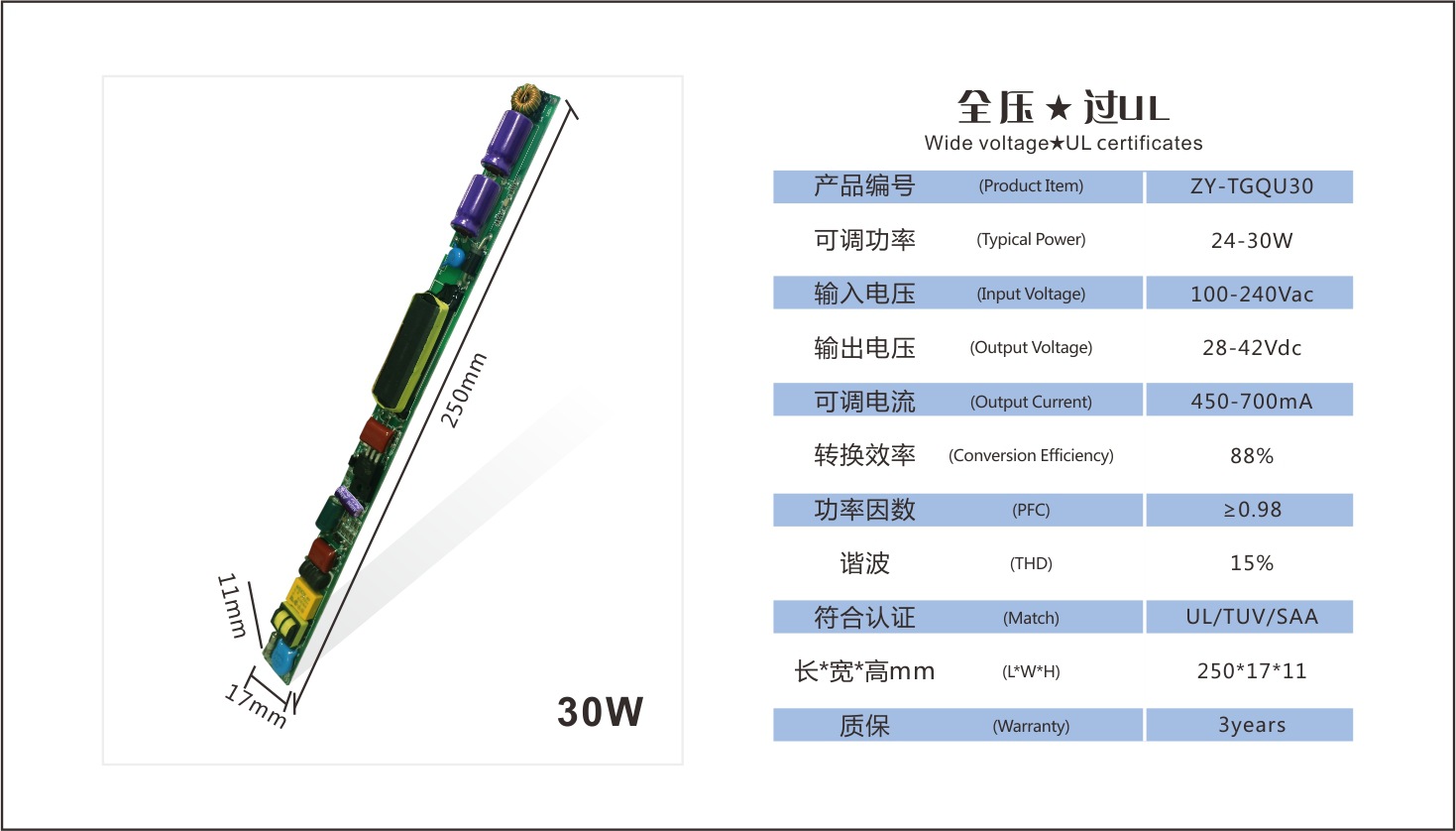 展品名称:正远电源 24-30W T8/T5 全压 高P 低谐波 过认证 LED日光灯电源展品品牌:正远科技展品型号: ZY-TGQU30