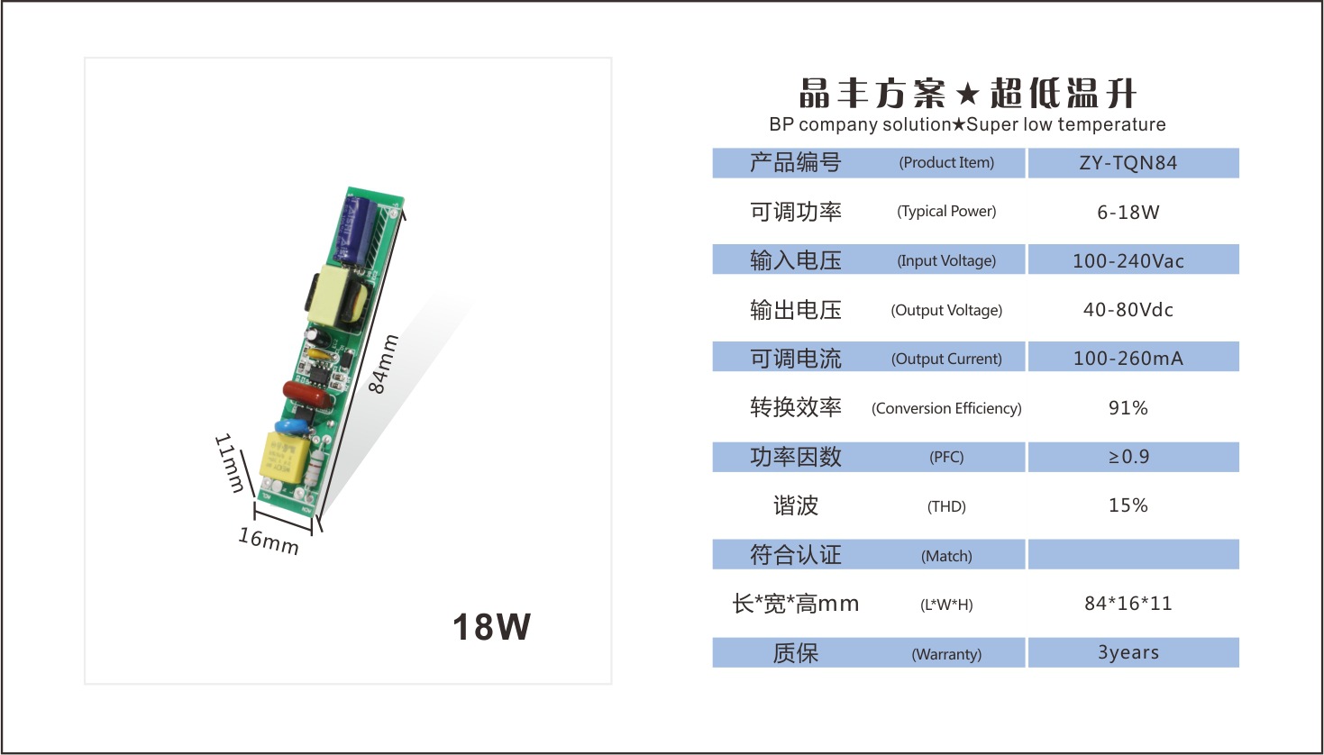 展品名称:正远电源 6-18W T8/T5 全压 高P 低谐波 超低温升 LED日光灯电源展品品牌:正远科技展品型号: ZY-TQN84