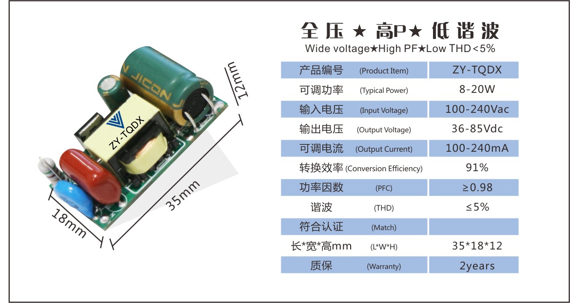 展品名称:正远电源 8-20W T8/T5 全压 高P 低谐波 非隔离LED堵头电源展品品牌:正远科技展品型号:ZY-TQDX