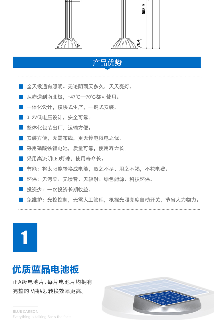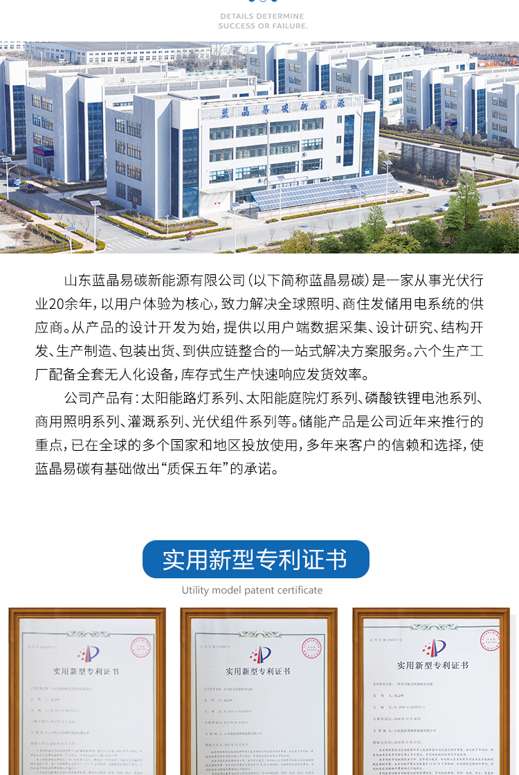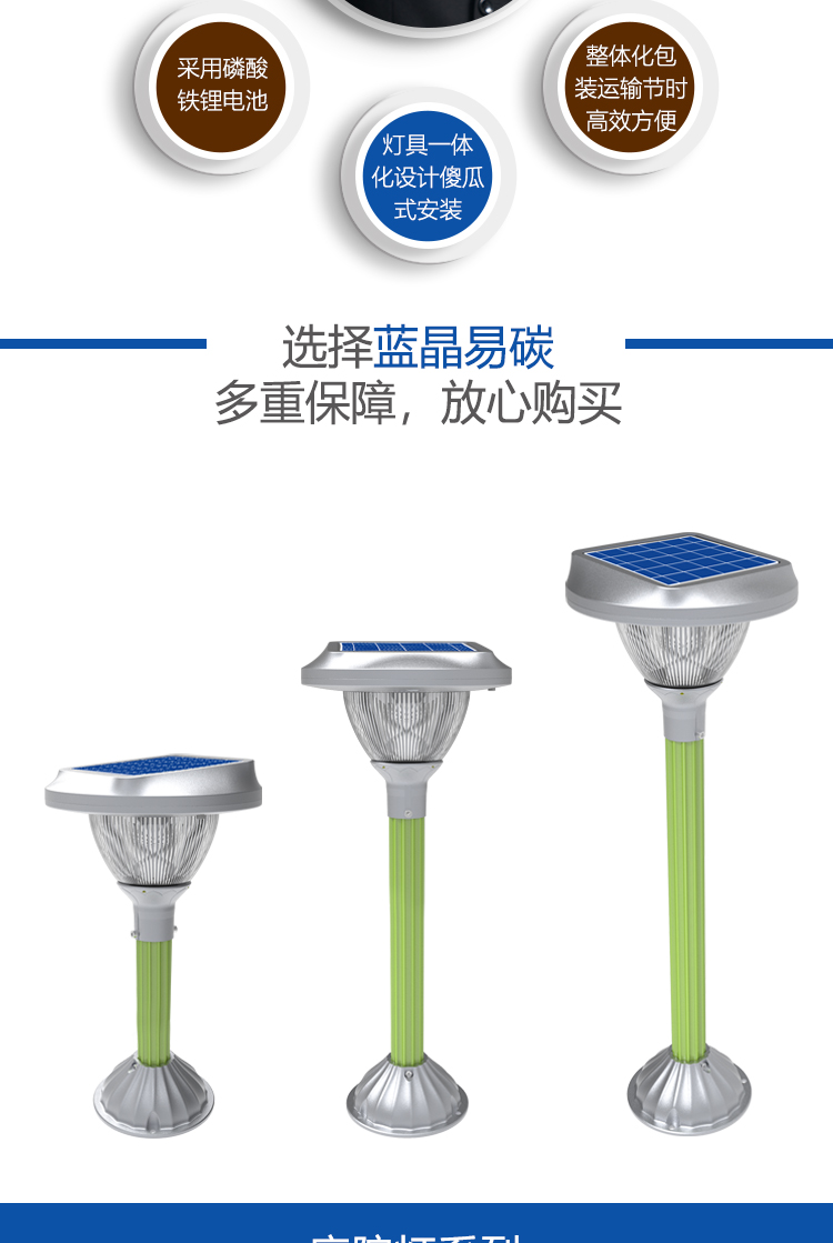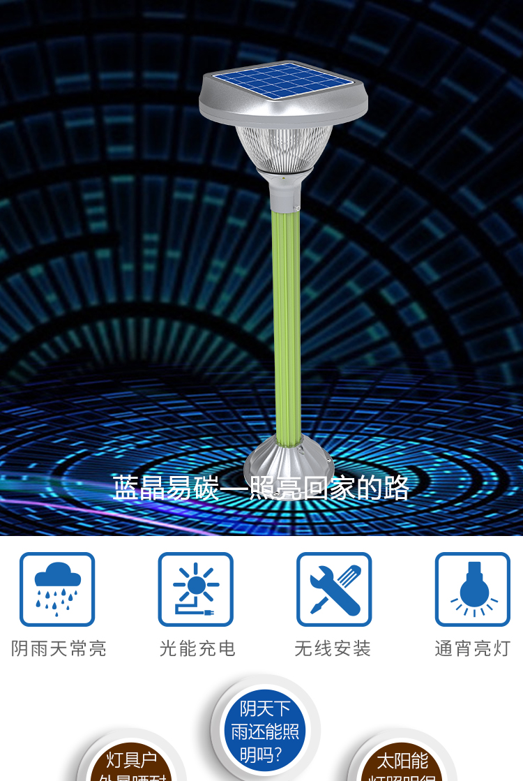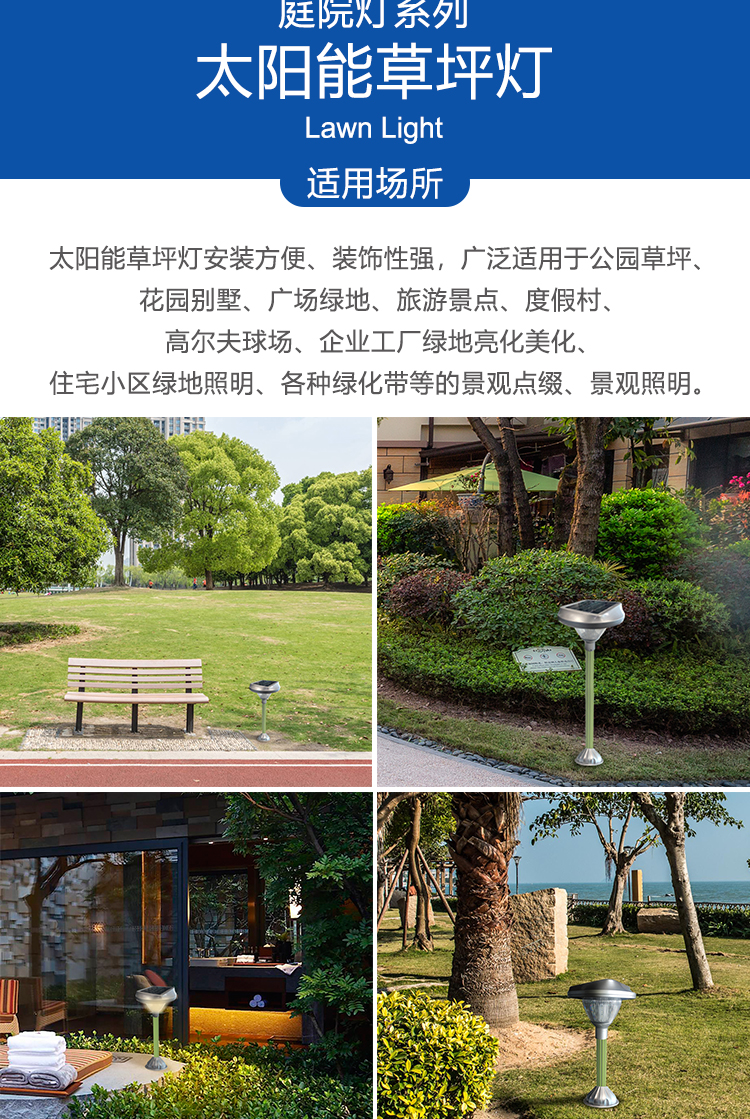 • 产品应用: 主要用于庭院、小区、别墅、景区、公园、广场、 乡路、村内道路、学校以及无电少电地区照明。