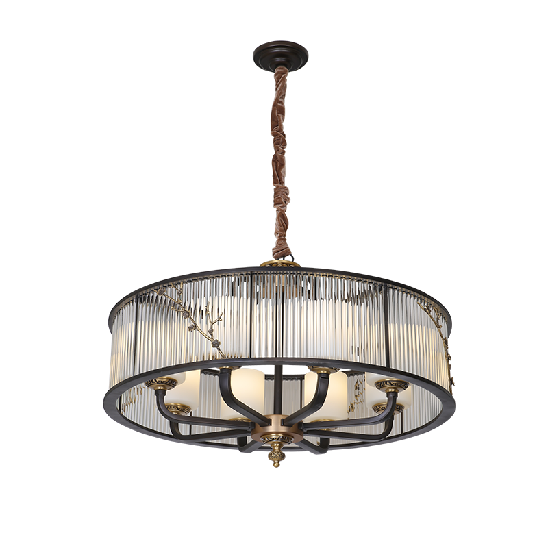 这款灯采用了铁艺+全铜装饰件的搭配,添加了玻璃棒的元素,让产品看上去沉稳大气中透露一点奢华的感觉。新中式里带着一点轻奢风,使这款产品变得相对百搭,并不局限于中式/新中式的装修风格。相比起纯中式的灯具,这款灯更百搭,搭配轻奢、现代装修风格也毫无压力。