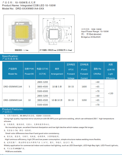 • 产品名称: 10-100W集成LED成光源