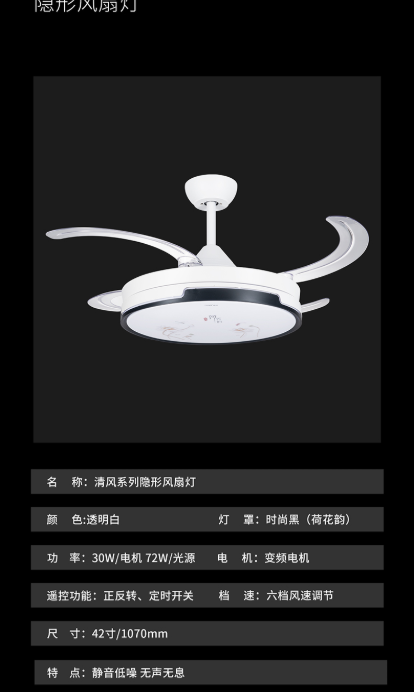 • 产品名称: 时尚黑荷花韵六档风速调节清风系列隐形风扇灯