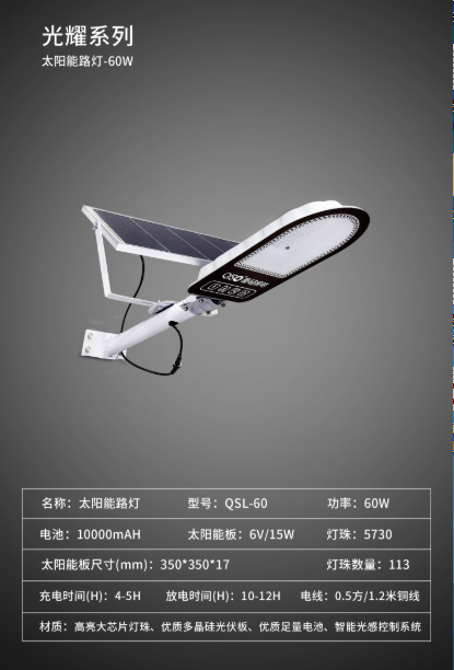 • 产品型号: 光耀系列长续航智能光感控制太阳能路灯