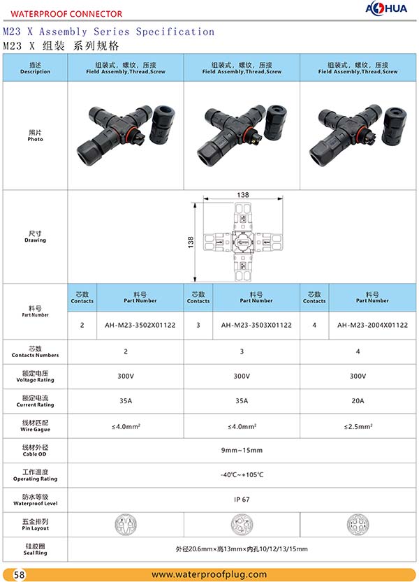 • AHUA 澳华M23 四通 螺丝 大功率 LED灯 防水连接器