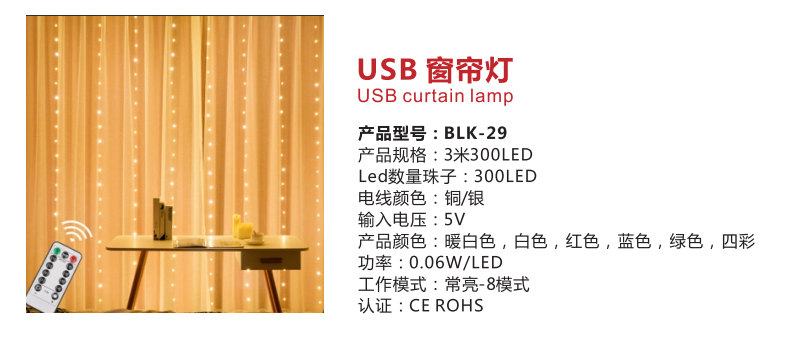 • 产品名称: LED室内家居多颜色常亮USB窗帘灯