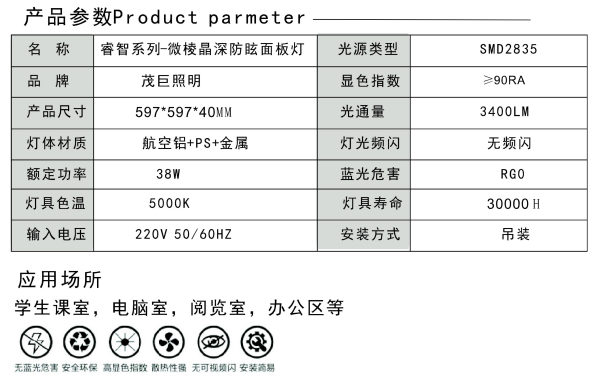 • 产品型号: 教育照明教室微棱晶深防眩面板灯睿智系列
