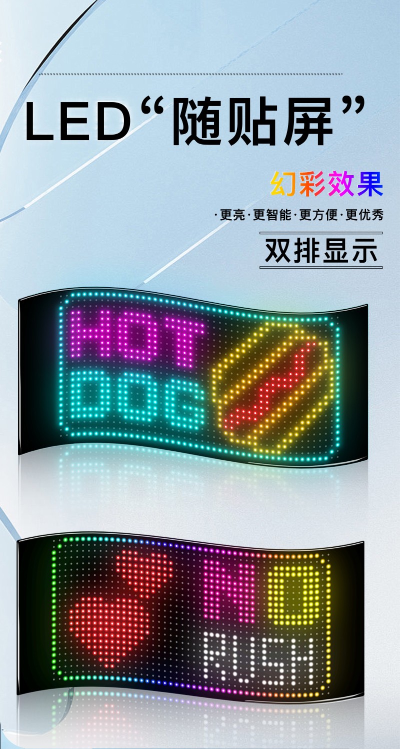 • 产品类型: 车载LED柔性广告屏、LED柔性橱窗广告屏、LED柔性门头广告屏、文旅网红打卡广告屏