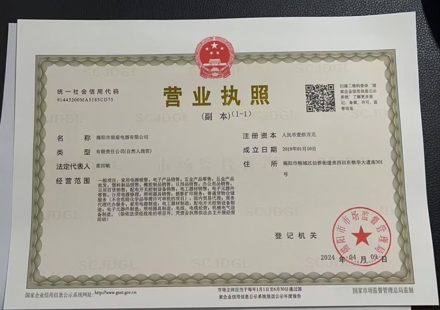 中国,广东省,揭阳市,广东省揭阳市榕城区仙桥镇崇文路狼盾电器有限公司